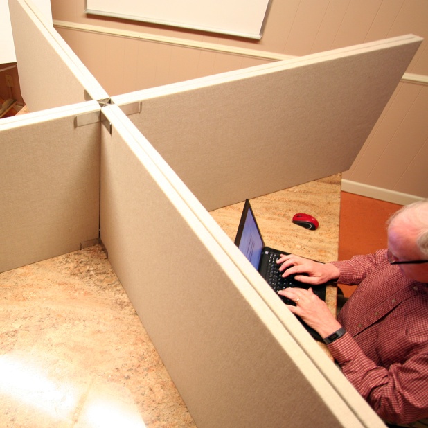Unser Privatsphäre PAL-Partitionsclip wird in Verbindung mit zurück an Back-starren akustischen Panels verwendet, um eine freistehende Desktop-Akustik-Partition zu erstellen. Benutzerdefinierte 2\"dicke Paneele werden mit 1\" gewickelten Gewebepaneelen hergestellt, die auf den Rücken zurückgeklebt sind. Dadurch erstellt ein Panel, das auf beiden Seiten Stoff hat. Die Paneele werden dann in die Datenschutzkörpern eingesetzt, um die Partition zu erstellen. Sie können dieses System für eine temporäre oder tragbare akustische Lösung verwenden.