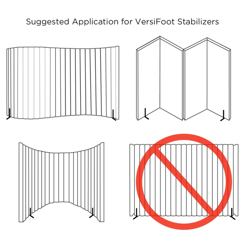 Unsere Verssifoot-Partitionsstabilisators ist ein Zubehör, das unserem versiteten, versipanel- oder Versipanel-Jr. akustischen Trennwänden Stabilität fügt. Es wird aus einer 1,5-Zoll-× 0,25-Zoll-Flachstange von 1,5 Zoll, mit zwei festen vertikalen 3/8\"Durchmesserstangen, die an der Basis geschweißt sind, hergestellt. Erstellen Sie \"l \" oder \"c \" leicht mit zwei oder mehr Versisentoot-Stabilisatoren. Bei zusätzlicher Stabilität befindet sich ein Loch in der Mitte der flachen Stahlstange. Sie können dies verwenden, um den Trennstabilisator zum Boden zu sichern.