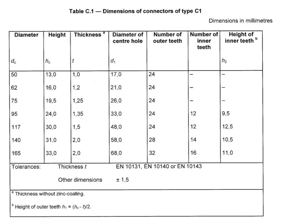 Ein Zahnplattenverbinder des Typs C1 (siehe Abbildung C.1) ist ein doppelseitiger Verbinder aus einer kreisförmigen Platte, deren Kanten geschnitten und gebogen werden sollen, um dreieckige Zähne zu bilden, die abwechselnd von gegenüberliegenden Gesichtern in 90 ° C ausstehen die Gesichter. Die Zähne müssen gleichmäßig um den Umkreis der Platte herumliegen und für Anschlüsse mit Durchmesser dc> = 95 mm um den Umfang des Bolzenlochs in der Mitte der Platte herum. Jede Platte hat zwei Nagellöcher zwischen der Mitte der Platte und dem Umfang und auf gegenüberliegenden Seiten des Bolt-Lochs. Die Abmessungen müssen der Tabelle C.1 entsprechen.
