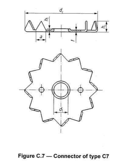 Ein Zahnplattenverbinder des Typs C2 (siehe Fig. C.2) ist ein einseitiger Verbinder aus einer kreisförmigen Platte, dessen, dessen, deren, deren dreieckigen Zähnen ausgebildet sind, geschnitten und gebogen werden sollen, um dreieckige Zähne zu bilden, die von einer Seite um 90 an der Fläche vorstehen. Die Zähne müssen gleichmäßig um den Umkreis der Platte herumliegen und für Anschlüsse mit Diamittel d,> 95 mm, zusätzlich zwischen dem Umfang der Platte und dem Bolzenloch in der Mitte der Platte. Das Bolzenloch Es gibt einen Flansch, der von demselben Gesicht wie die Zähne projiziert. Jede Platte hat zwei Nagellöcher durch die Platte, zwischen der Mitte der Platte und dem Umfang und auf gegenüberliegenden Seiten des Beißlochs. Die Abmessungen müssen der Tabelle C.2 entsprechen.