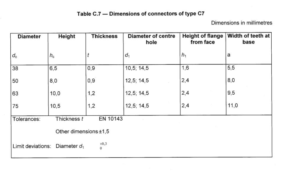 Ein Zahnplattenverbinder vom Typ C7 (siehe Abbildung C.7) ist ein einseitiger Verbinder, der aus einer kreisförmigen Platte mit einem Bolzenloch durch die Mitte besteht. Zwei Nagellöcher können in der Mitte zwischen der Mitte und der Vertreibkupplung und auf gegenüberliegenden Seiten des Bolzenlochs gebohrt werden. Die Kanten der Platte werden geschnitten und gebogen, um die dreieckigen Zähne in Form von dreieckigen Zähnen umzusetzen, die gleichmäßig um den Umfang herum beabstandet sind und von einer Fläche um 90 ° nach dem Gesicht steigen Die Abmessungen müssen in der Tabelle C.7 entsprechen.