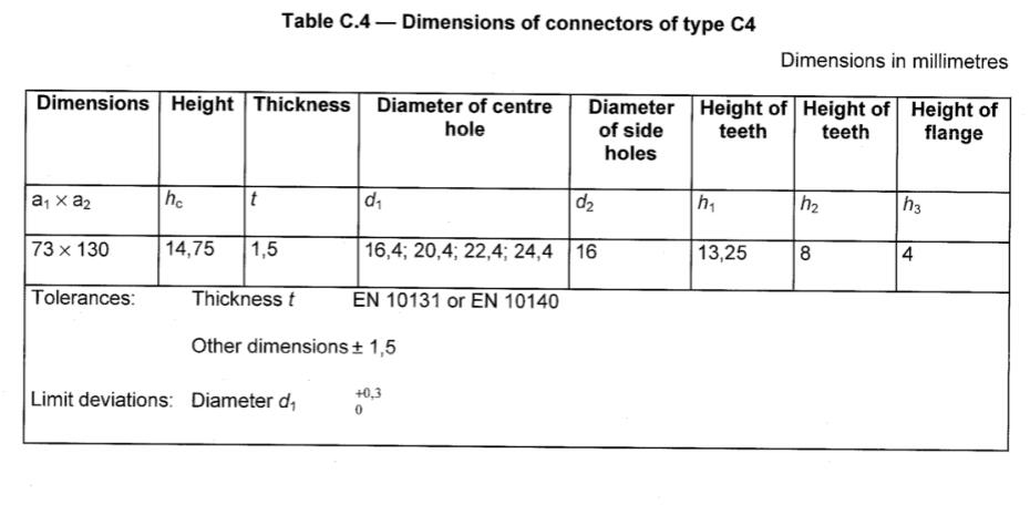 Ein Zahnplattenverbinder des Typs C4 (siehe Abbildung C.4) ist ein einseitiger Verbinder, der aus einer ovalen Platte hergestellt ist, dessen, deren die dreieckigen Zähne gebogen werden sollen, um dreieckige Zähne zu bilden, die von einer Seite um 90 ° nach dem Gesicht vorstehen Die Zähne müssen 14 in der Anzahl liegen. Die Höhe von drei Zähnen, die in der Mitte jeder längeren Seite der Platte angeordnet sind, ist kleiner als die Höhe der anderen Zähne. Jede Platte hat drei Löcher durch die Platte, eine größere inthe der Mitte der Platte und zwei kleiner zwischen der Mitte der Platte und dem Umfang und aufpunsitten Seiten des Mittellochs in längerer Richtung. Um das Mittelloch herum gibt es einen Flansch, der das gleiche Gesicht wie die Zähne projiziert. Die Abmessungen müssen der Tabelle C.4 entsprechen.