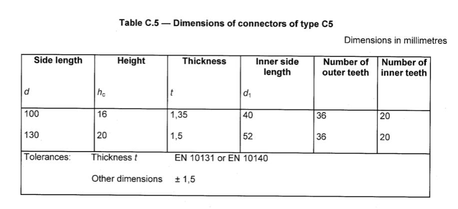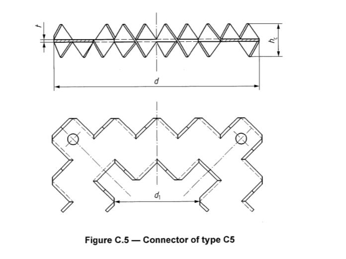 Ein Zahnplattenverbinder vom Typ C5 (siehe Abbildung C.5) ist ein doppelt einspezieller Verbinder, der aus einer quadratischen Platte hergestellt ist, dessen, dessen, deren dreieckige Zähne gebogen werden sollen, um dreieckige Zähne zu bilden, die abwechselnd von gegenüberliegender Facesat 90 an den Gesichtern vorstehen. Die Zähne müssen gleichmäßig entlang des Umkleens und entlang des quadratischen Lochs in der Keilgüte der Platte beabstandet sein. Jede Platte muss in jeder Ecke der Platte ein Nagelloch haben. Die Abmessungen müssen in der Tabelle C.5 entsprechen.